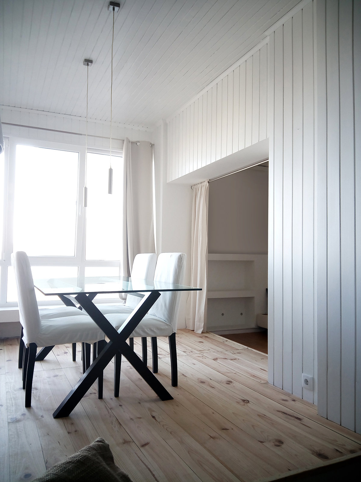 One of the main goals in this small refurbisment was to give it a fresh and youthfull look . Since the balcony had previously been closed, there was a need to define two social areas, a living room and a dinning room. The need to invite the light in, provided by the southern orientation was one of the main concerns in choosing materials and colors, opting for light colours . Also there was a diference in pavement heights that need correcting. A pine platform designed the dinning room area, separating and defining social and private areas. The bathroom and kitchen were both refurbished and the circulation restructured, creating an open space one bedroom apartment.