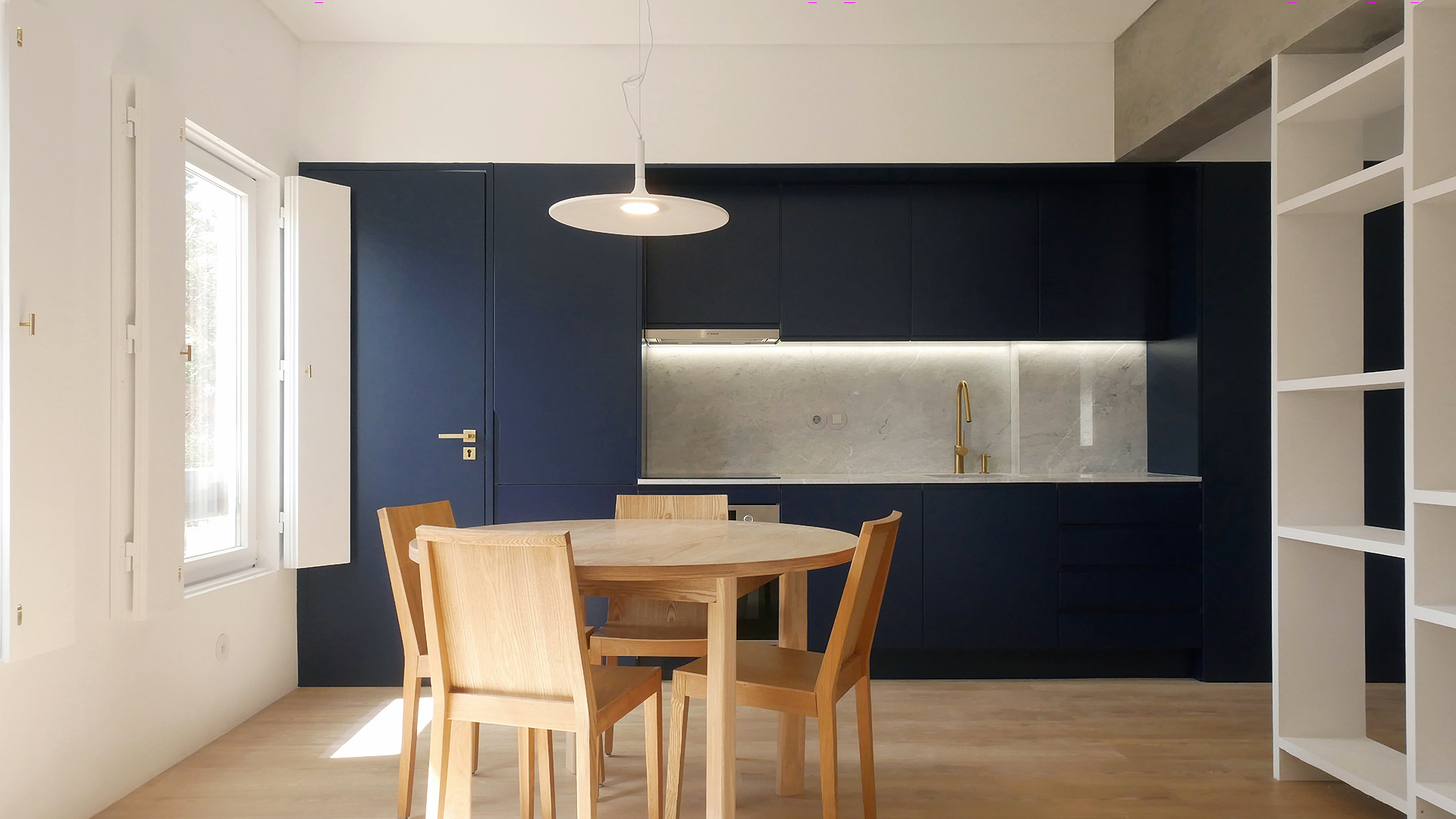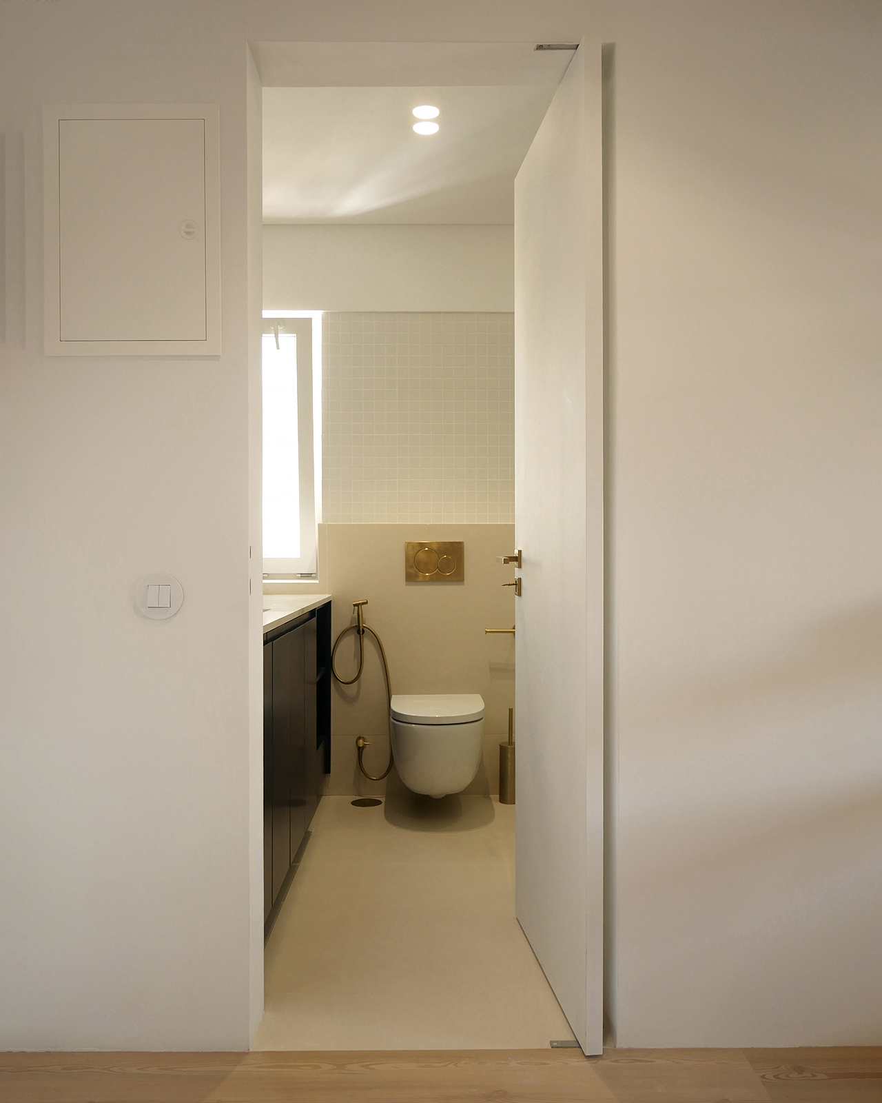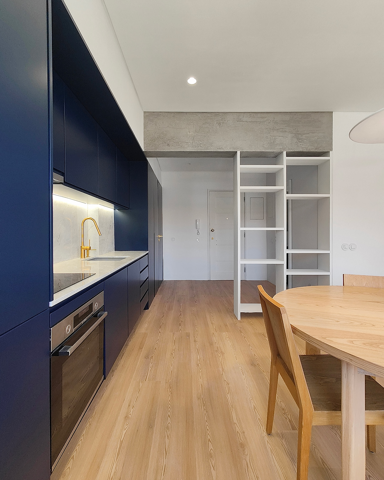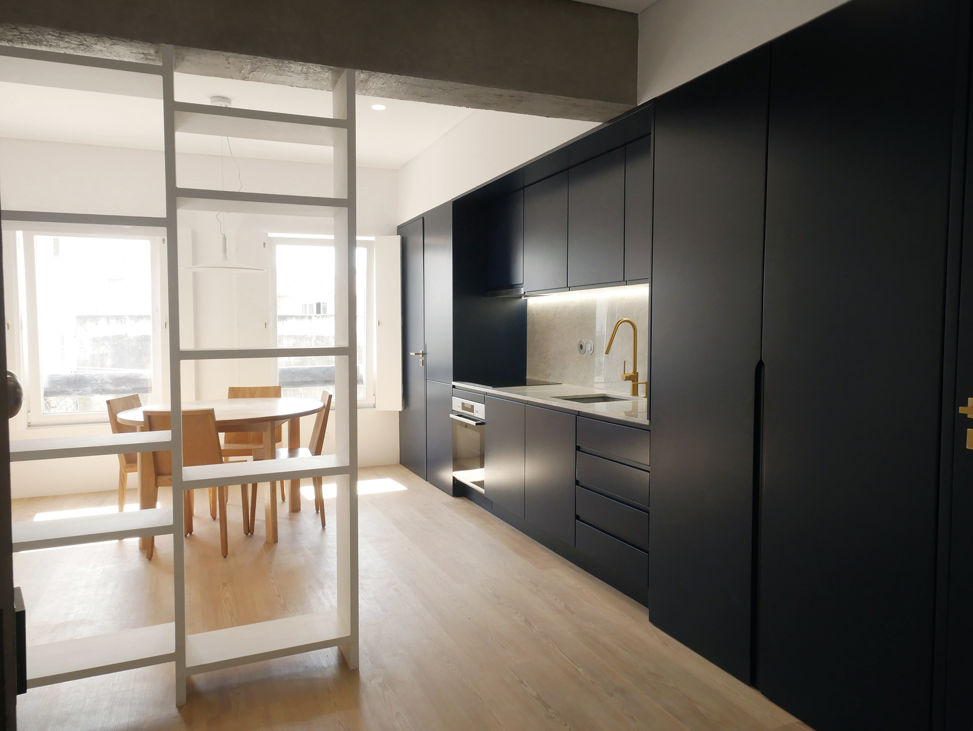 In this 2025 apartment refurbishing, the original 1970 two bedroom apartment still had the old compartmentalized layout that gave this apartment a small and dark feel, not taking advantage of the southern light that bathed this appartment in the afternoon. The first intervention was then to take advantage of the apartments orientation and demolish all the walls that sufocated the space, creating two definite areas divided by a central carpentry body. On the social side ( left ), it would create the kitchen and laundry.  On the private side