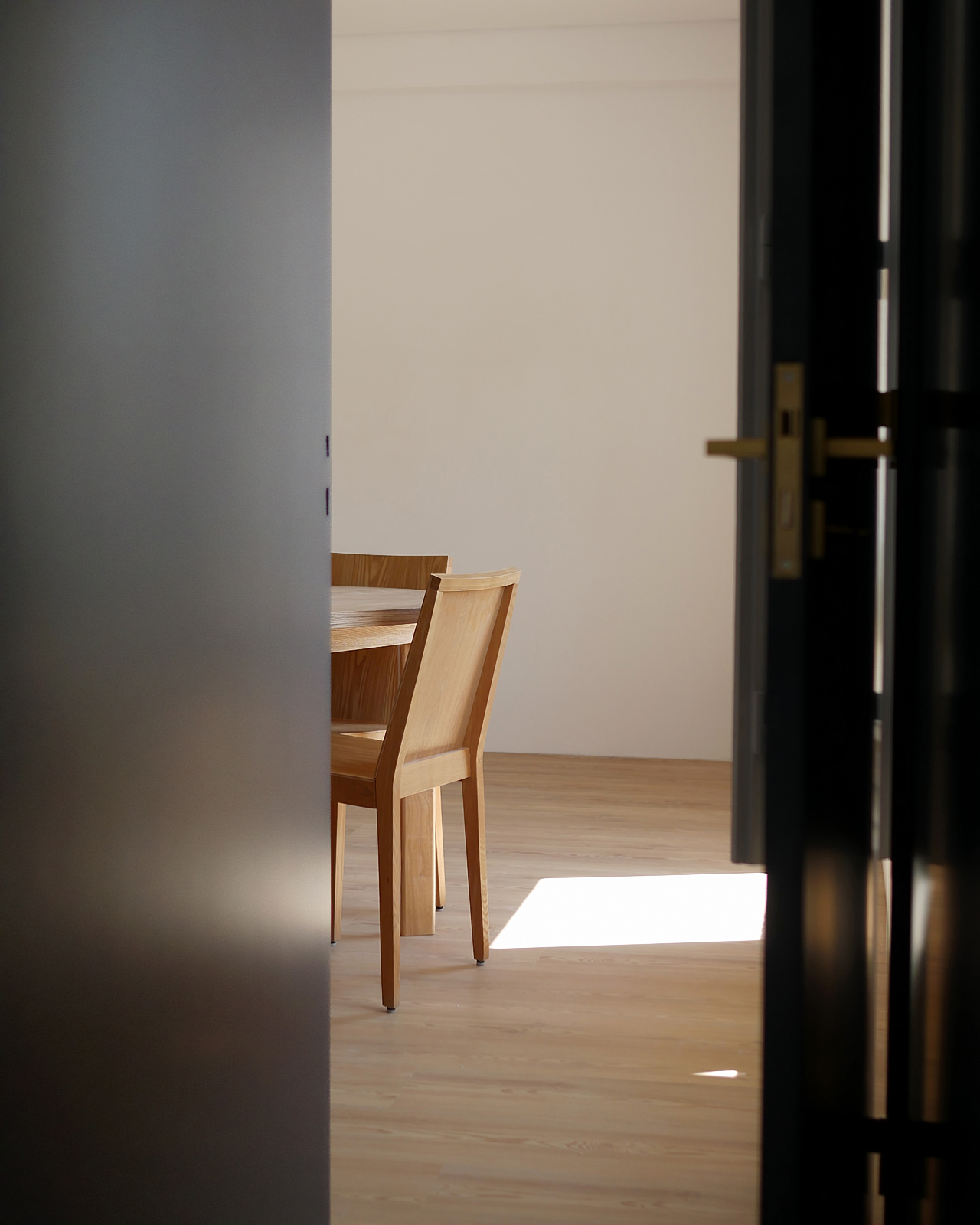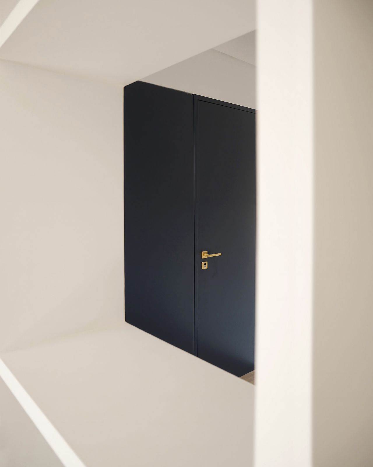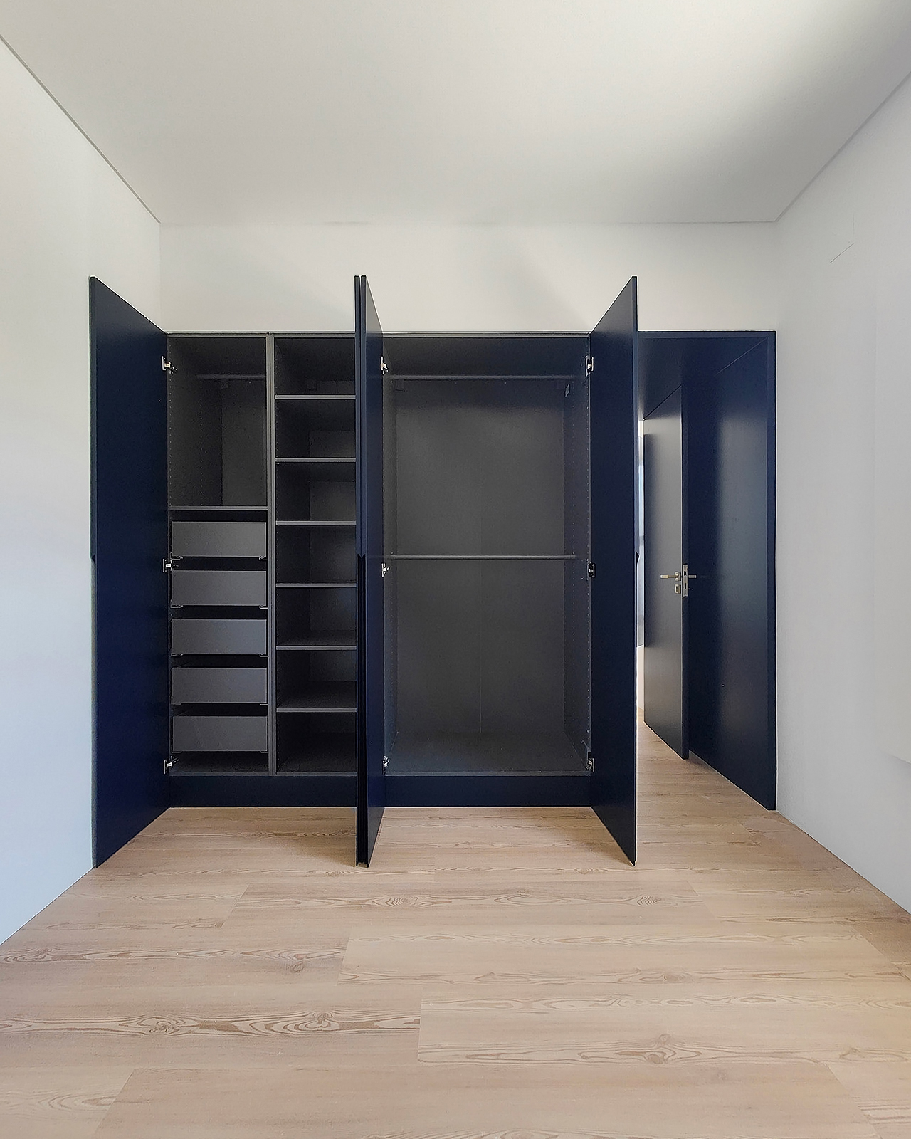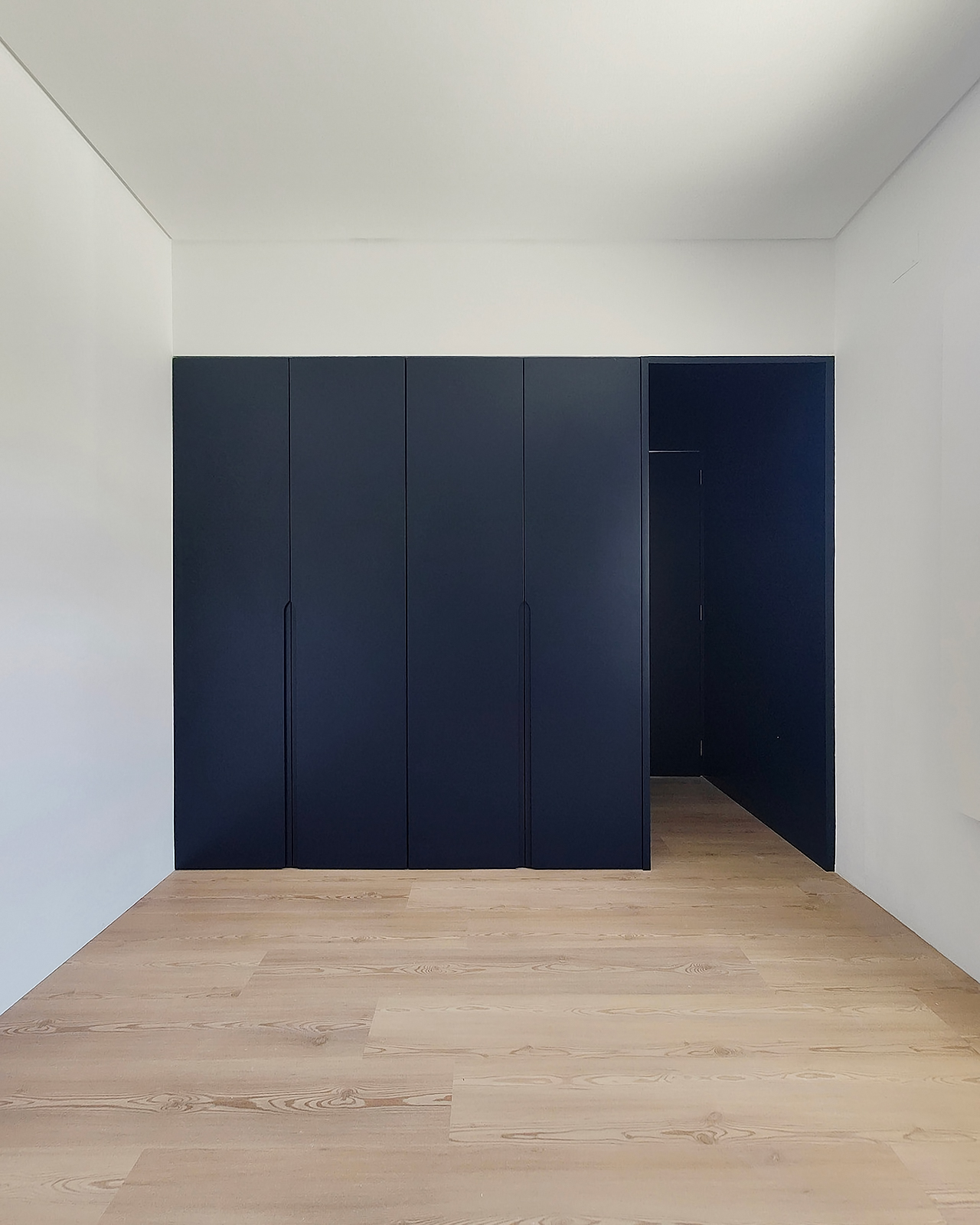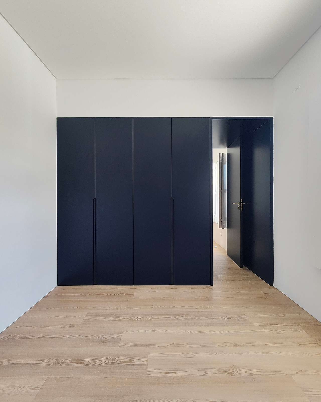In this 2025 apartment refurbishing, the original 1970 two bedroom apartment still had the old compartmentalized layout that gave this apartment a small and dark feel, not taking advantage of the southern light that bathed this appartment in the afternoon. The first intervention was then to take advantage of the apartments orientation and demolish all the walls that sufocated the space, creating two definite areas divided by a central carpentry body. On the social side ( left ), it would create the kitchen and laundry.  On the private side