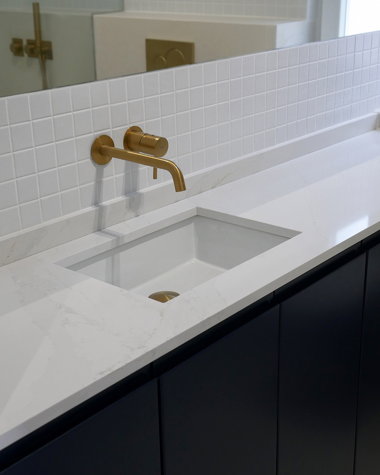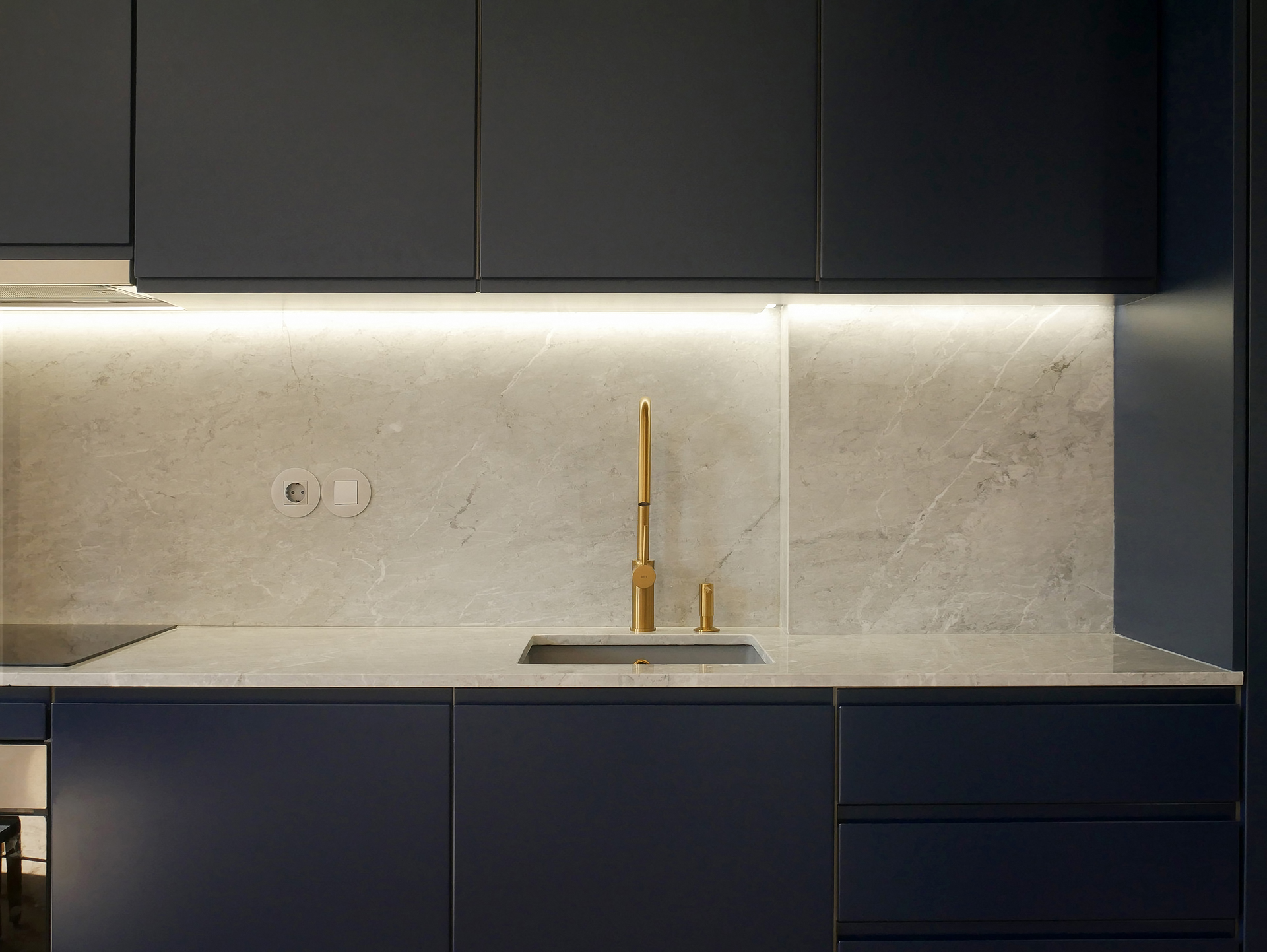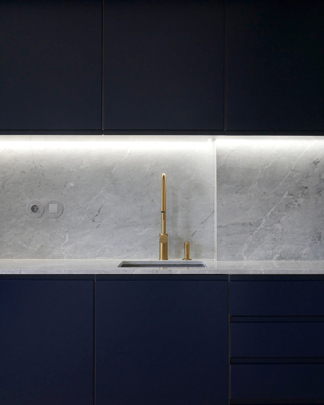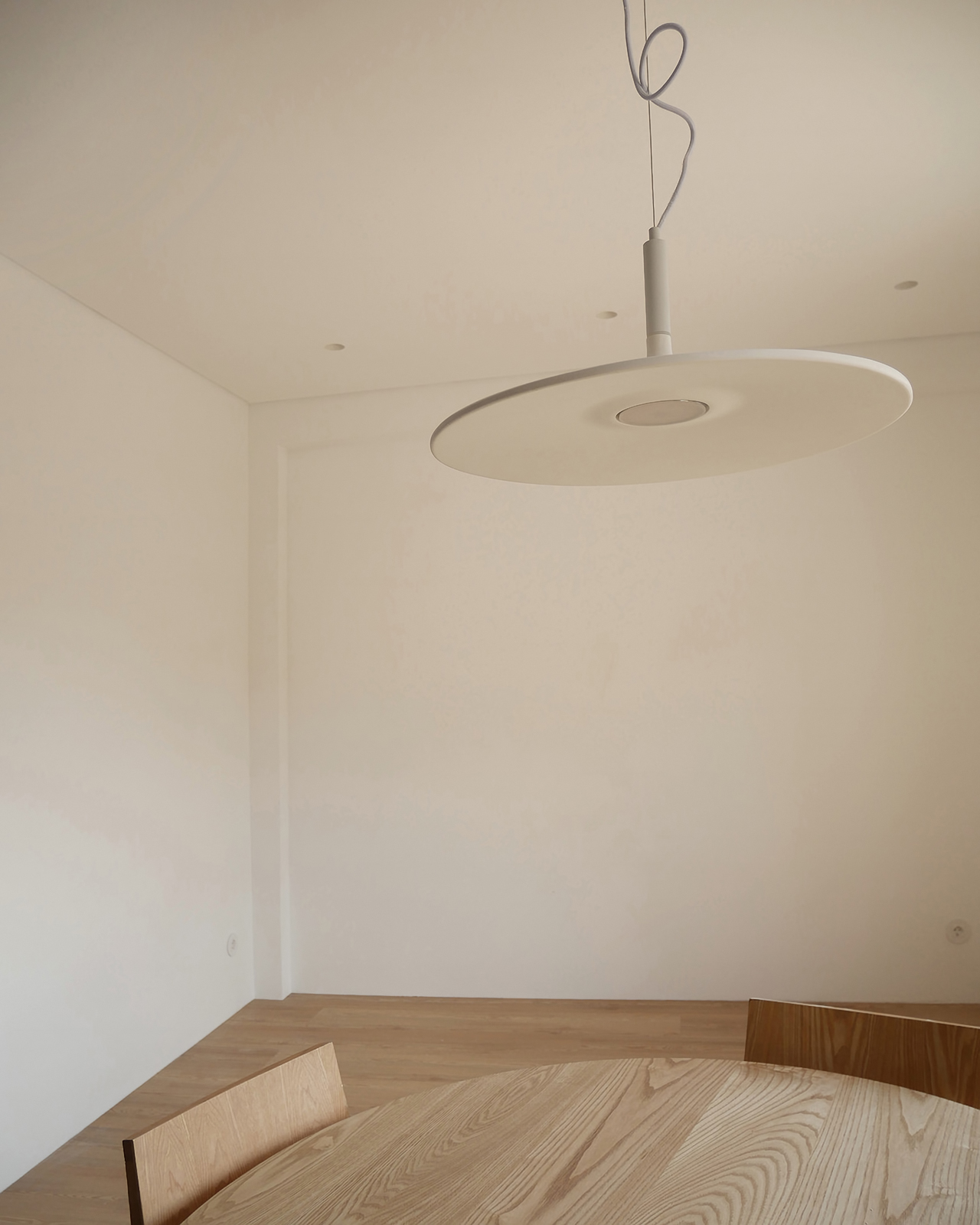 In this 2025 apartment refurbishing, the original 1970 two bedroom apartment still had the old compartmentalized layout that gave this apartment a small and dark feel, not taking advantage of the southern light that bathed this appartment in the afternoon. The first intervention was then to take advantage of the apartments orientation and demolish all the walls that sufocated the space, creating two definite areas divided by a central carpentry body. On the social side ( left ), it would create the kitchen and laundry.  On the private side